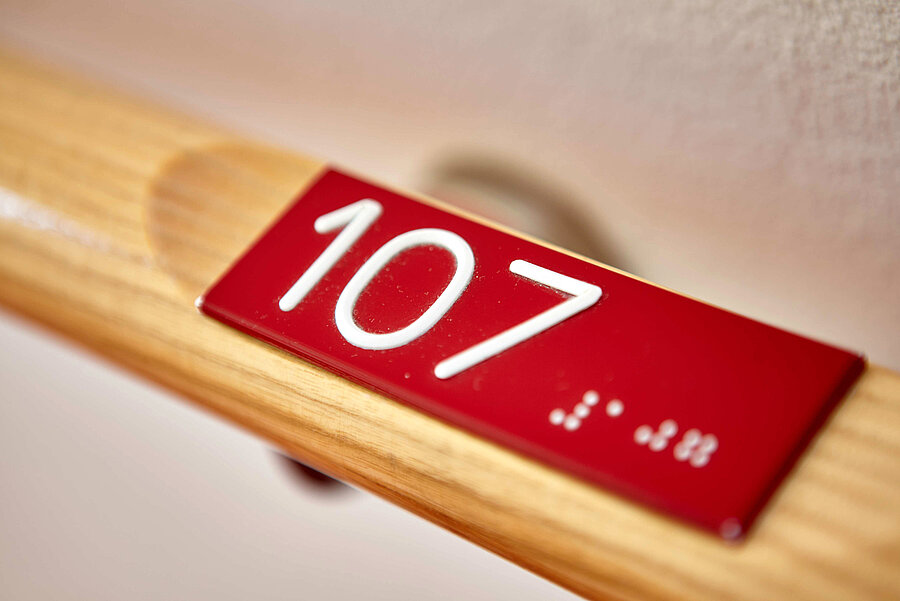 Die barrierefreie Gestaltung sorgt dafür, dass Sie sich jederzeit sicher und selbstbestimmt orientieren können. Der Lift ist mit akustischen Etagen- und Raumansagen ausgestattet. Die Flure sind in kontrastreichen Farben gehalten, und die Zimmer sind mit Schildern in Schwarzschrift, Punkt- und Taktilschrift versehen. Ein Leitliniensystem in der Lobby, dem Restaurant und dem Übergang zum Seminargebäude hilft bei der Orientierung. Zudem gibt es mit einem Wasserspiel einen akustischen Anhaltspunkt am Haupteingang. Unsere Parkanlage ist mit Rundwegen angelegt und abends gut beleuchtet, sodass Sie auch bei Dämmerung sicher unterwegs sind.