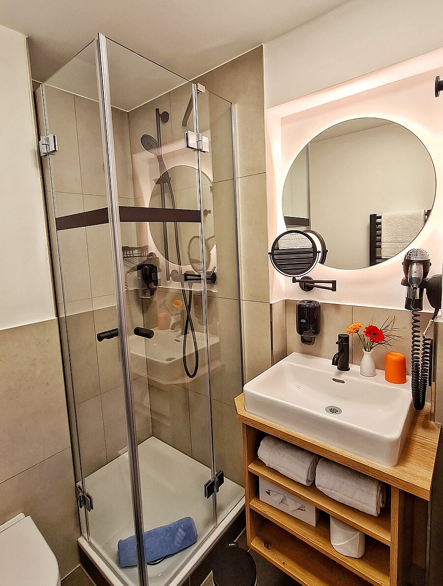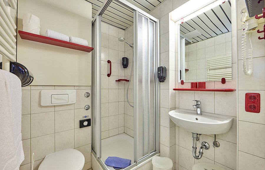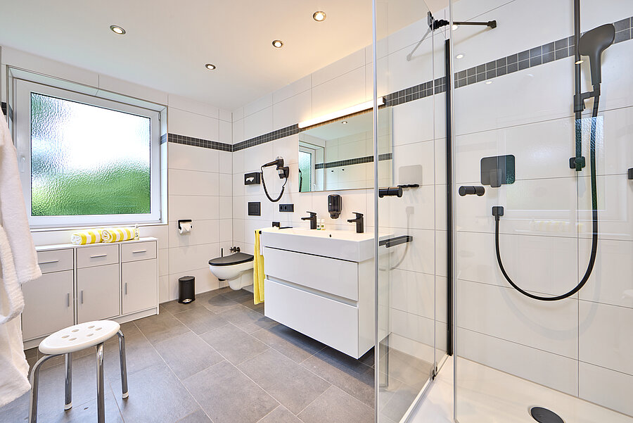 Für unsere rollstuhlfahrenden Gäste bieten wir drei barrierefreie, geräumige Hotelzimmer mit extra großen Bädern, die speziell auf ihre Bedürfnisse abgestimmt sind. Sprechen Sie uns gerne direkt darauf an.